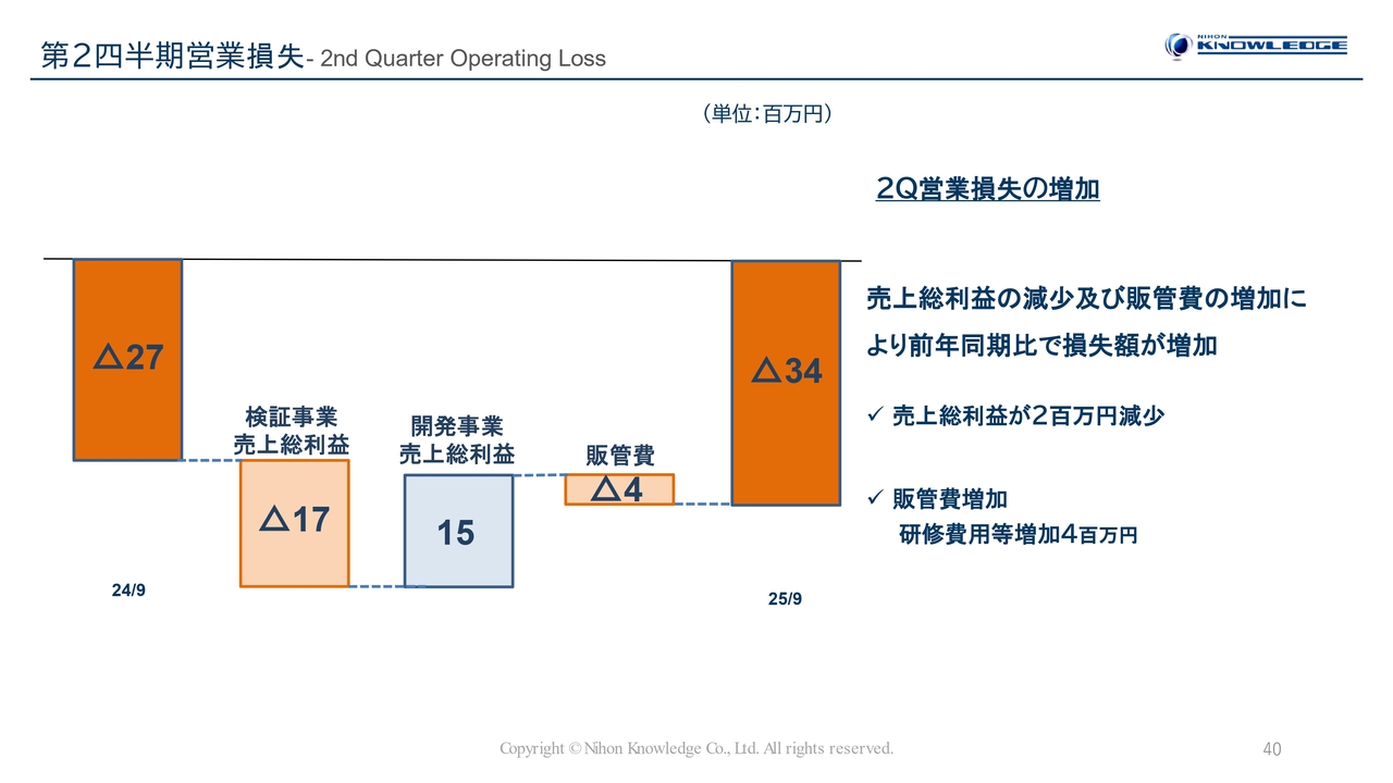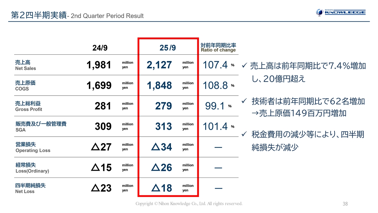 一方で、前年同期に引き続き営業損失は3,400万円、四半期純損失は1,800万円という結果になっています。理由については再三ご説明しているとおり、今年は全社員の1割強となる49名の新入社員を採用したことが影響し、前期はややマイナスでの折り返しとなっています。
