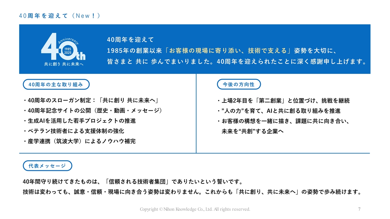 その他にも、40周年を機にAIの活用を推進しています。また、ベテラン技術者による支援体制も強化しているところです。自社でノウハウが不足している分野については、産学連携にも力を入れています。