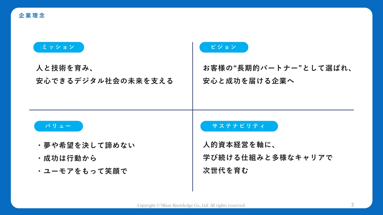バリューは「夢や希望を決して諦めない」「成功は行動から」「ユーモアをもって笑顔で」を掲げており、これらは創業以来の行動指針です。サステナビリティとして「人的資本経営を軸に、学び続ける仕組みと多様なキャリアで次世代を育む」を設定しました。