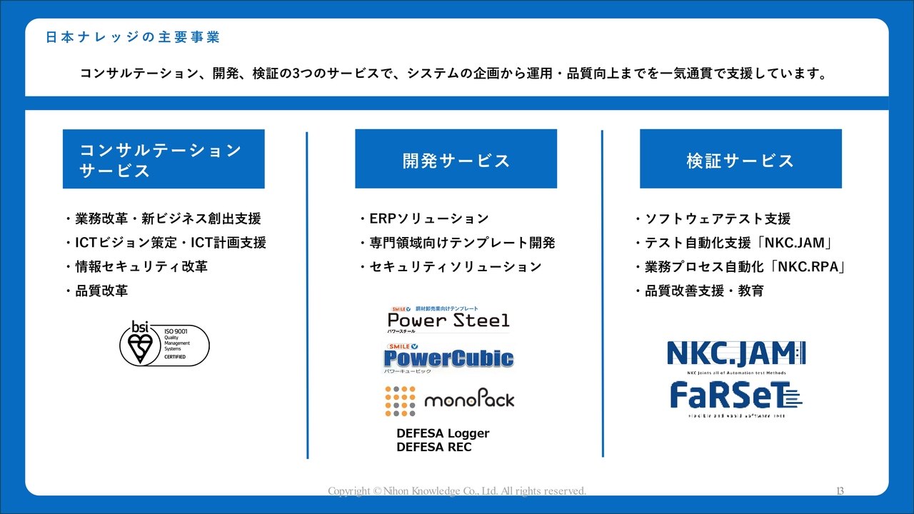 藤井:事業の概要についてご説明します。先ほどもお話ししましたが、当社の柱はコンサルテーションサービス、開発サービス、検証サービスの3つです。当社はもともと開発から始まった会社です。