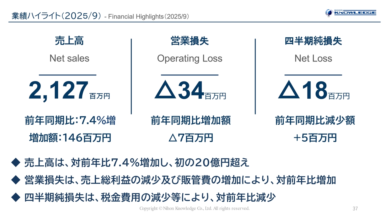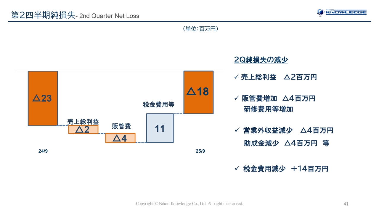 藤井:純損失についても同様の理由です。前年同期よりも損失幅が縮小しているのは、税金などの費用計算が変わったことで、若干ながらマイナスを抑えられたためです。
