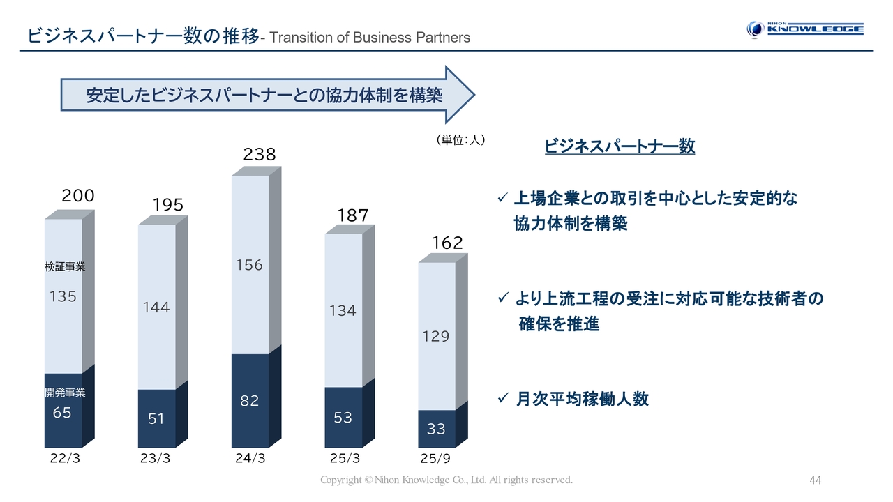 藤井:ビジネスパートナーさまについてです。ピーク時には200名以上いらっしゃいましたが、社員が増えたことで現在は減っています。今後売上を伸ばしていく上で、再びビジネスパートナーさまを積極的に採用し、ご協力いただく方向で考えているところです。