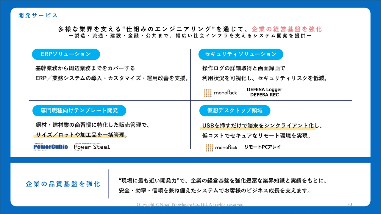 藤井:次に、開発サービスについてご説明します。大きな変更はありませんが、ERP、つまり業務系のパッケージが当社の強みです。具体的には、大塚商会さまの「SMILE」という中小企業向け、NECさまの「EXPLANNER」という中堅向け、そしてインフォコムさまの「GRANDIT」という上場会社向けの各領域においてERPを提供しています。これらのカスタマイズや開発支援を柱として、今後も成長が期待できる分野だと考えています。