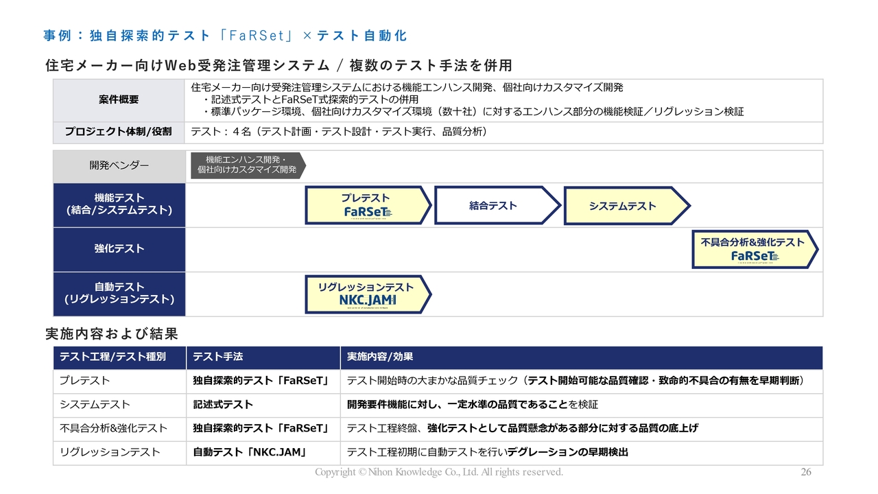 藤井:「FaRSet」を組み合わせたテストの事例をお話しします。テストというと、完成品を人間が動かしてチェックすることをイメージされることが多いと思います。しかし、完成後も不具合が多い場合、集中的に不具合箇所を検証したり、総合テストをやり直したり、その後に部分的な強化テストを実施したりすることがあります。このように、複数の手法を組み合わせることで効率的なテストを実現できることも当社の特徴です。