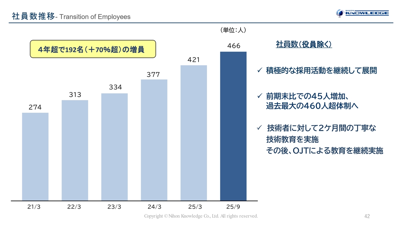 藤井:社員数についてです。当社は社員がいなければ仕事が成り立たないため、この4年間で192名純増しています。