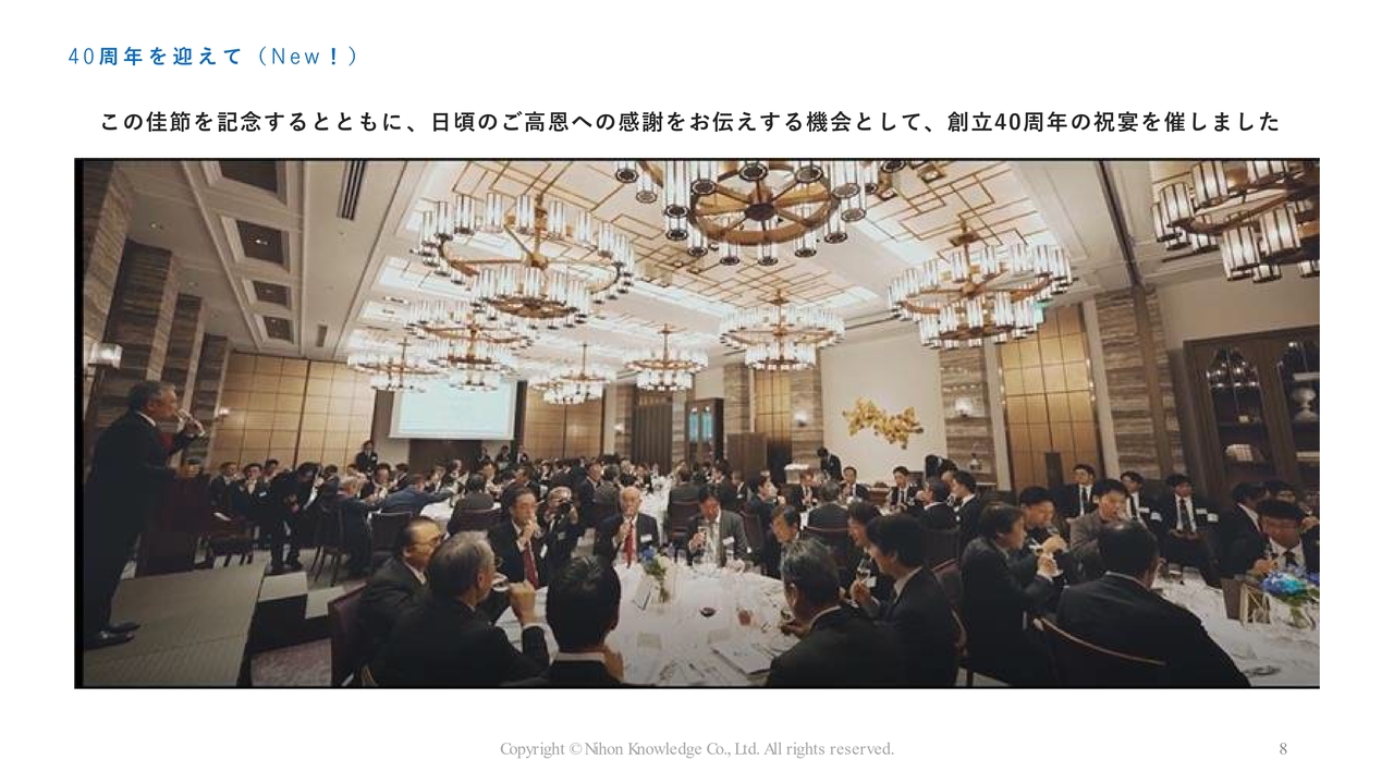 藤井:スライドの写真は、10月22日に開催した40周年記念パーティの様子です。当社ではこれまで社員のみでお祝いしていましたが、今回は初めてお客さまをお招きしてパーティを行いました。大塚商会さまからは大塚社長にご参加いただきました。また、日本電気(NEC)さまやリコーさまからもご参加いただき、とても和やかな雰囲気の中で40周年を迎えることができました。