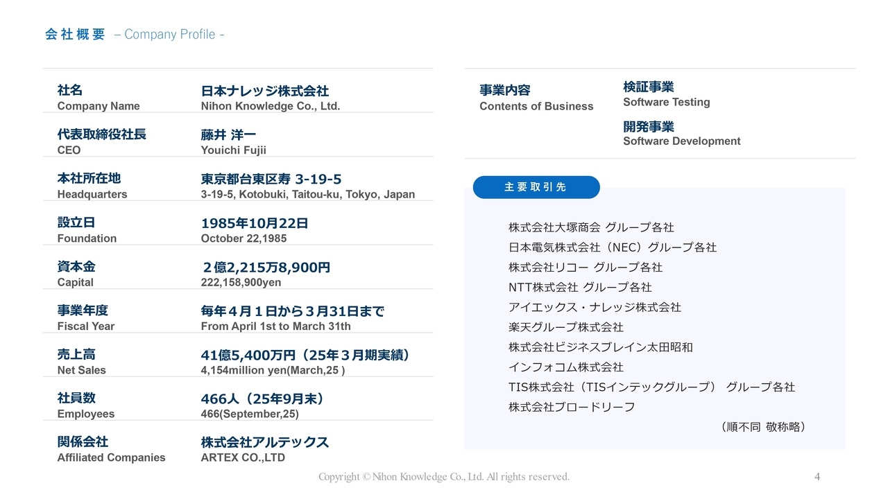 藤井:スライドは会社概要です。本社は台東区寿、すなわち浅草になります。IT企業にとっては非常に珍しく、下町に本社があります。設立は1985年で、今年10月で40周年を迎えます。前期の売上高は41億円、従業員数は466名です。取引先としては、大塚商会さまを含めたグループ、日本電気(NEC)さま、リコーさまなど、大手企業が中心となっています。