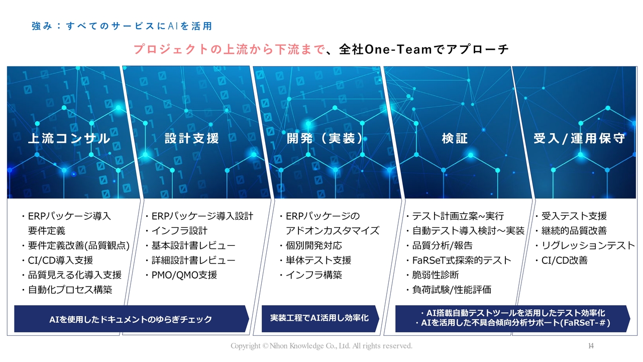 プロジェクトの上流から下流まで一気通貫でサービスを提供することで、お客さまがその都度リクエストをする必要がなく、良い品質のものを提供できると考えています。この一気通貫サービスの中で、すべてにAIを活用する取り組みを現在進めています。