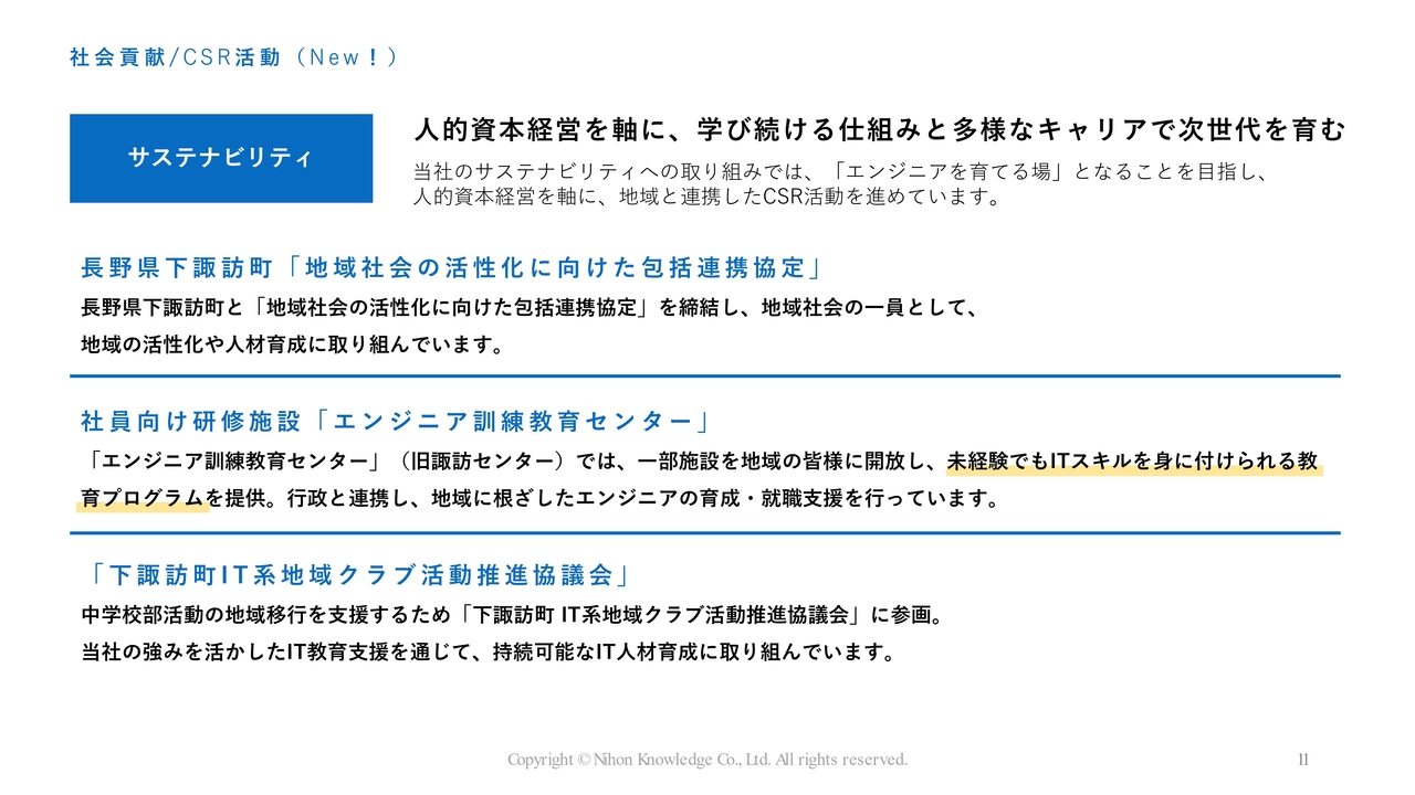 藤井:サステナビリティについてお話しします。諏訪にセンターを設立したことを契機に、長野県下諏訪町と包括連携協定を締結しました。この一環として、旧諏訪センターを「エンジニア訓練教育センター」という名称にし、地元のIT教育のセンターとして新たに立ち上げています。現在、地元の支援を受けながら教育活動を進めているところです。