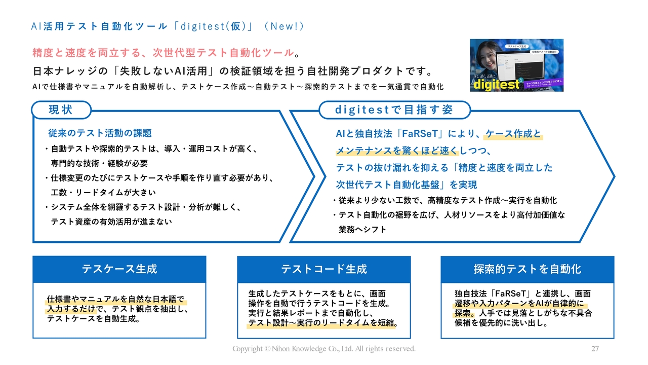 これは、自社のテストチームの存在自体に影響を及ぼしかねない、首を絞めることにもなる商品です。AIの進化はこのような方向に進んでいると考えています。しかし、これだけですべてが解決するわけではありません。当社としては、効率化を目指し、引き続きこの取り組みを進めています。