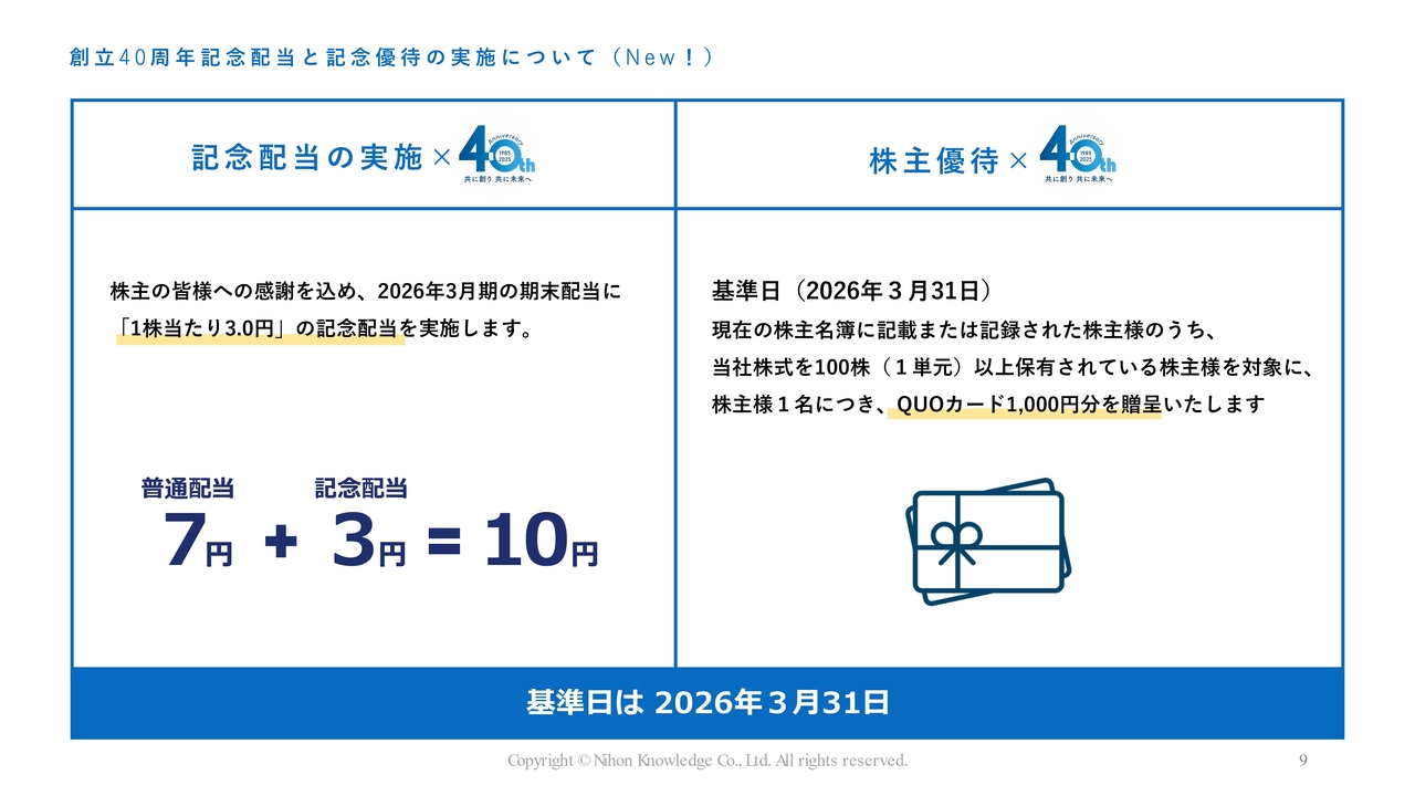 藤井:40周年記念施策として、株主のみなさまにも、1株当たり3.0円の記念配当を実施することにしました。2026年3月期の期末配当は、普通配当7.0円に記念配当3.0円を加えた合計10.0円と発表しています。「前期は1株当たり20円の配当だったから減配ではないか?」との投稿をいただいていますが、株式を3分割したため、これを考慮いただければと思います。