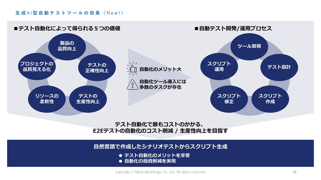 藤井:そのとおりです。現在、多くのAIツールが市場に出ていますが、一気通貫でサービスを提供するものはまだなく、どの企業もそこを目指して進めています。ただし、一般的で簡単なテストの自動化は間違いなく進むため、当社も遅れないように取り組んでいます。
