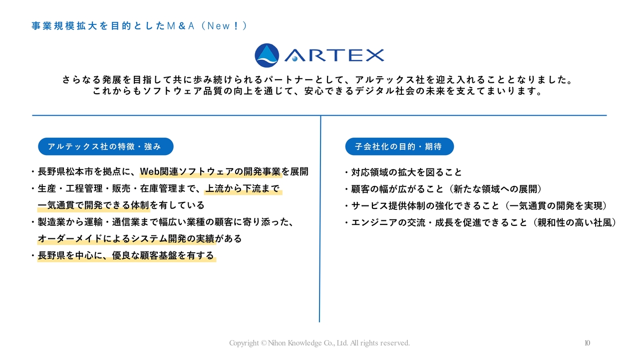 藤井:大きなトピックスとして、初めてのM&Aにより、10月1日付で長野県のアルテックスを子会社化しました。アルテックスはWeb関連のソフトウェア開発に非常に強みを持つ会社です。当社は業務系、特にスクラッチ系の仕事が多く、Web系の開発にやや弱い部分がありました。そのため、その部分を補うという意味でも非常に大きなシナジー効果があると考えています。