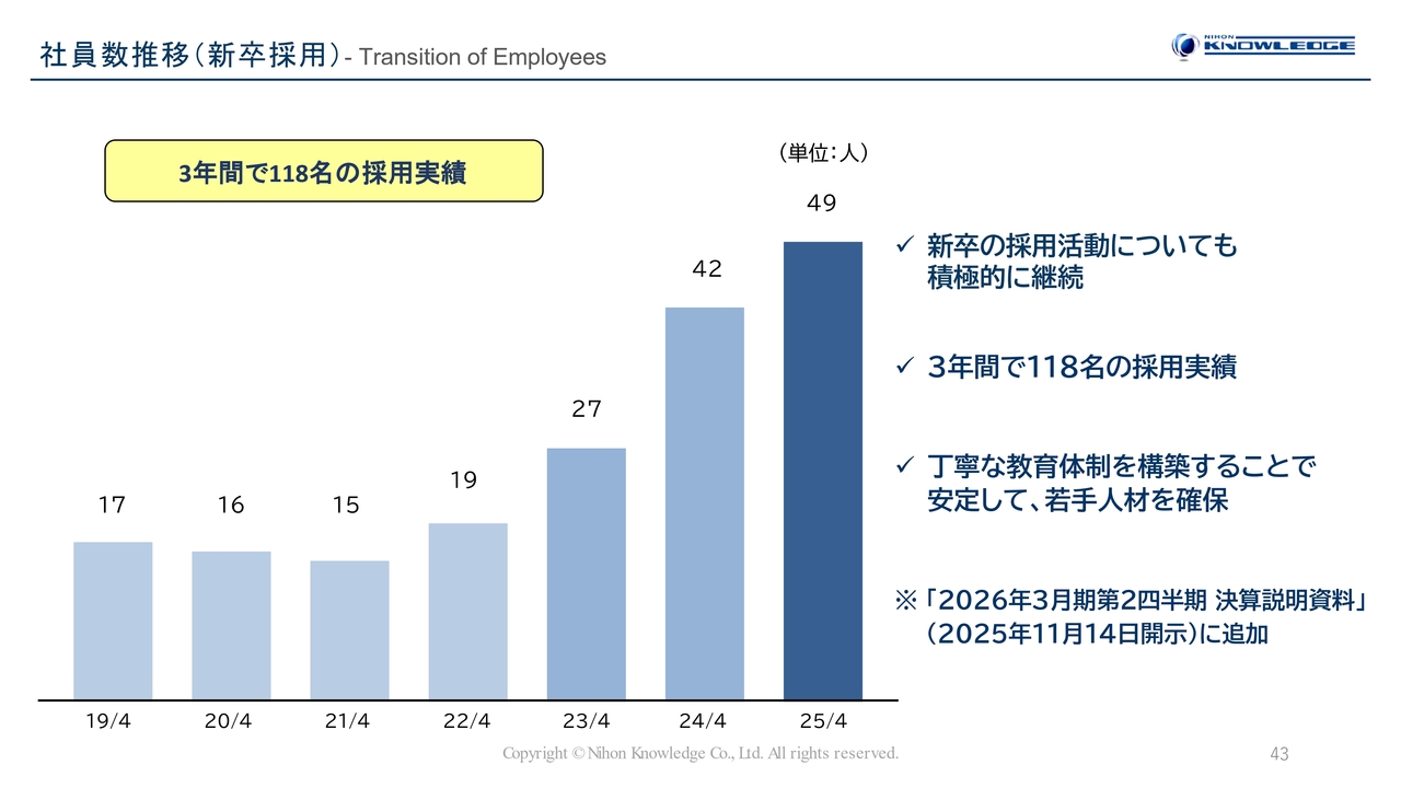 藤井:この192名のうち、過去3年間で新卒が118名という状況です。当初はIRで60名採用するという目標を発表しましたが、採用事情が厳しい中でも一定数を採用できていると考えています。ただし、その結果として、教育体制や教育にかかる時間が予想より若干増加しています。