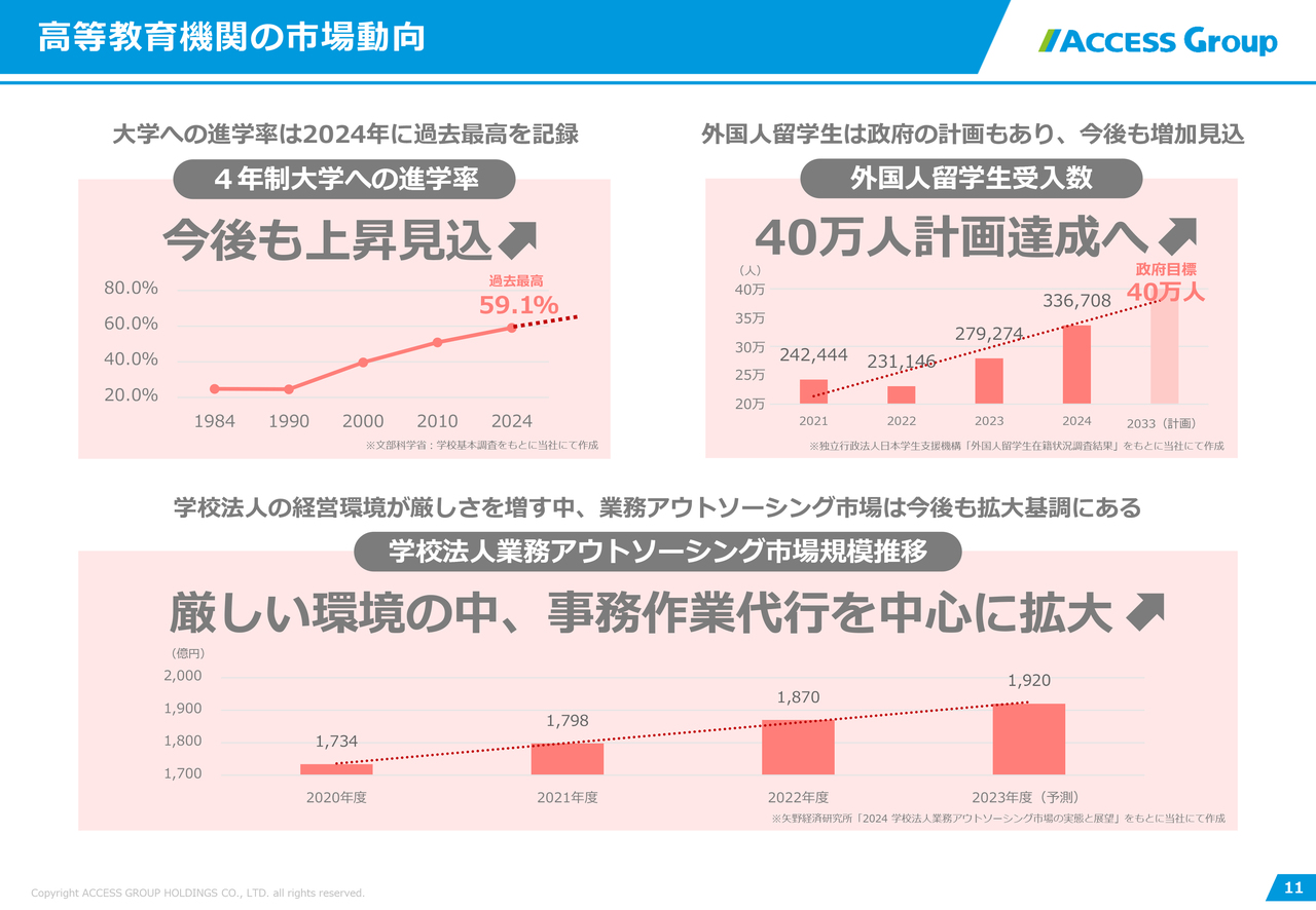 木村:高等教育機関の市場動向です。ご承知のとおり、外国人留学生の受け入れについては引き続き拡大していくという国の方針があります。進学率については、現状ではほぼ6割に近い状態です。今後もこの進学率は上昇していく見込みです。