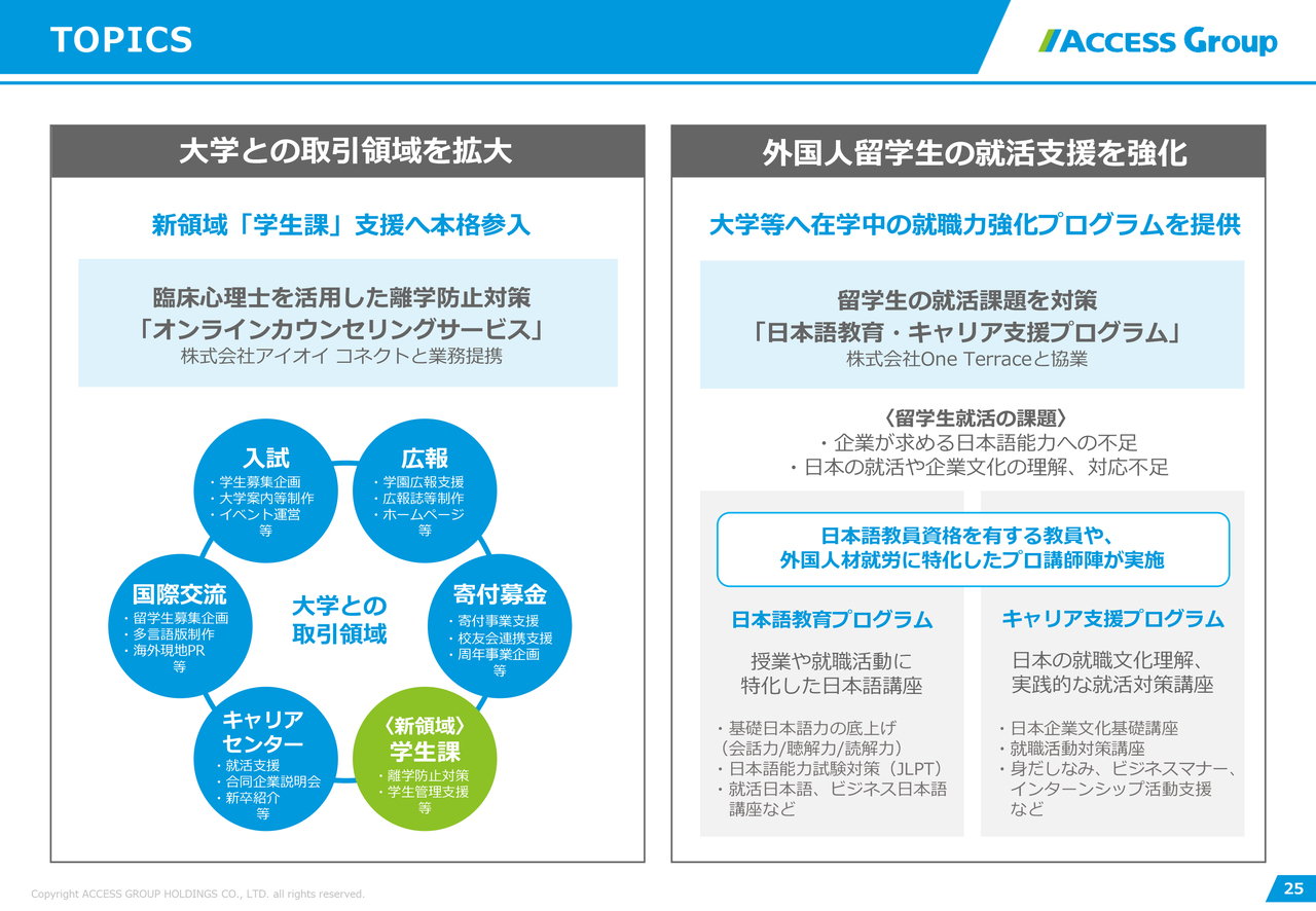 木村:トピックスについてです。大学との取引分野を拡大しており、さまざまな部署との連携が広がっています。先日は、臨床心理士を活用した離学(退学者)防止対策として、オンラインカウンセリングサービスの導入を始めました。