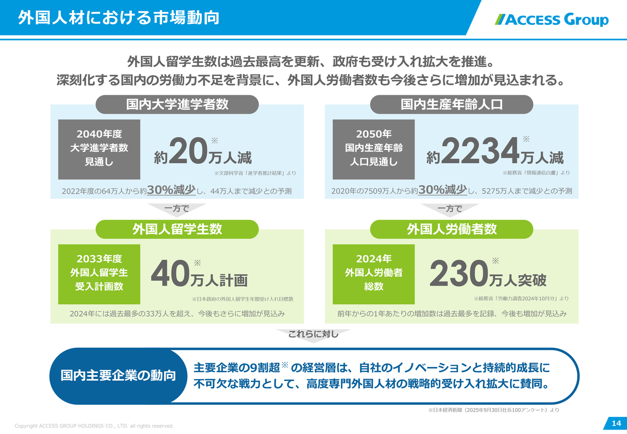 さらに、主要企業の9割超の経営層が、持続的成長に不可欠な戦力として高度専門外国人材の戦略的受け入れ拡大に賛同しているという統計もあります。このため、この分野も追い風になると考えています。