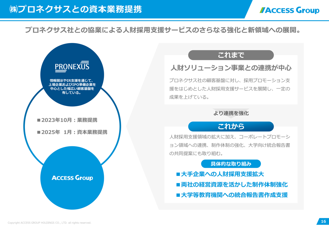 プロネクサス社は、人材採用において各企業が抱える課題に対応する方針のもと、人材採用領域に注力されています。この点で私たちの考えと一致しており、ここを一層強化していきたいと考えています。