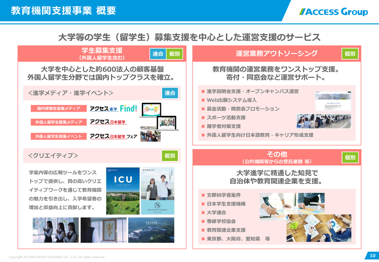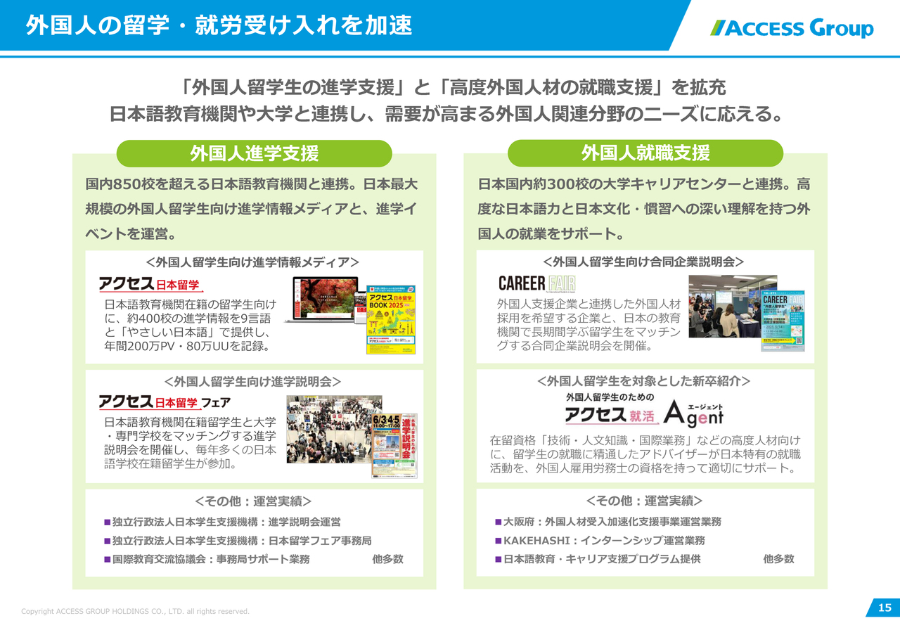 スライド左側の外国人進学支援についてです。日本語学校から日本の大学に行く外国人進学支援において、当社はトップシェアを誇っています。今後、さまざまなメディアをさらに増やしていきたいと考えています。