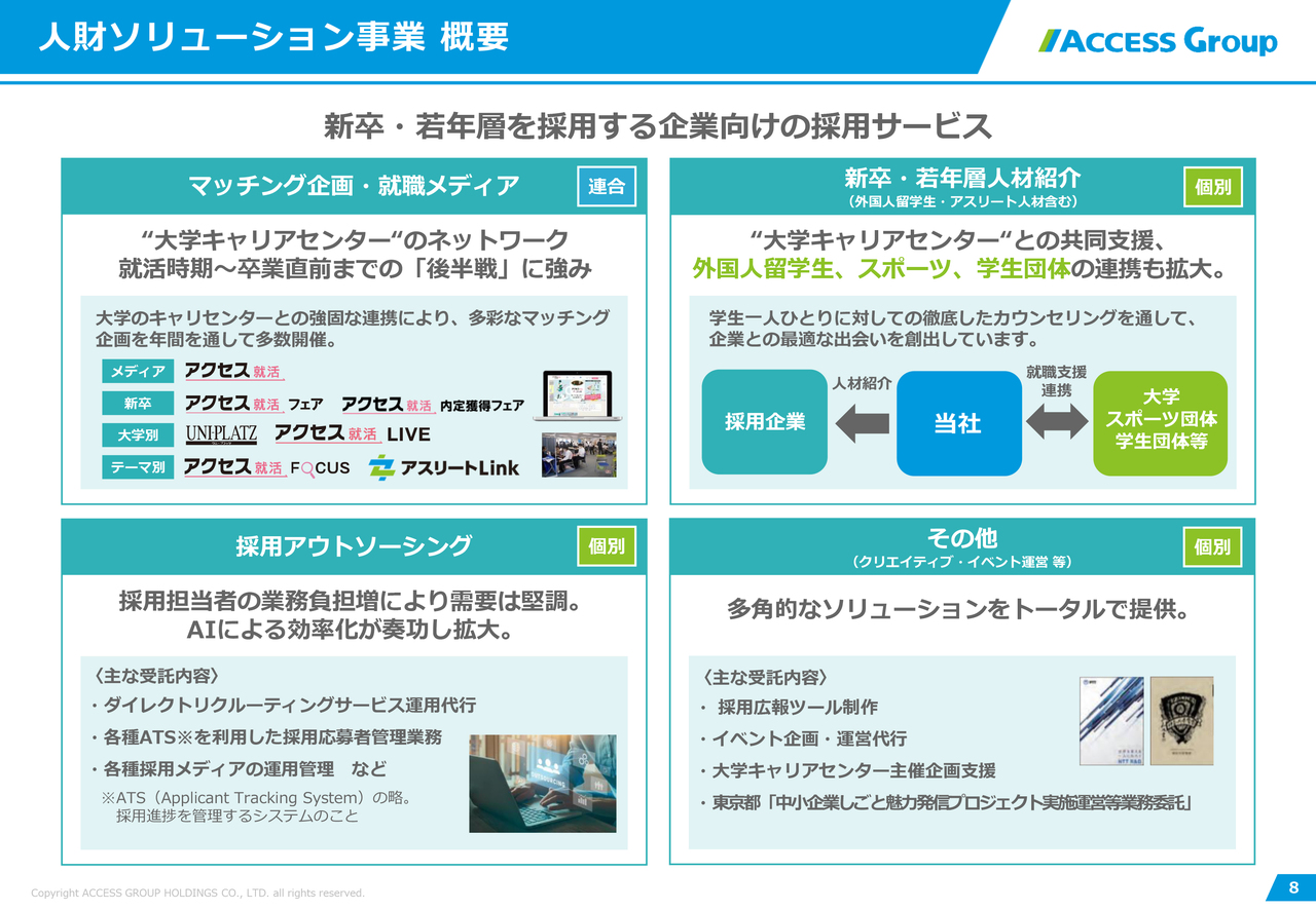 さらに、スライド左下の採用アウトソーシング事業は、非常に大きな成長を遂げている分野です。今、採用担当者は非常に大きな労力を費やして採用活動を行っています。多くのスカウト活動や業務に相当な工数をかけて取り組まれています。