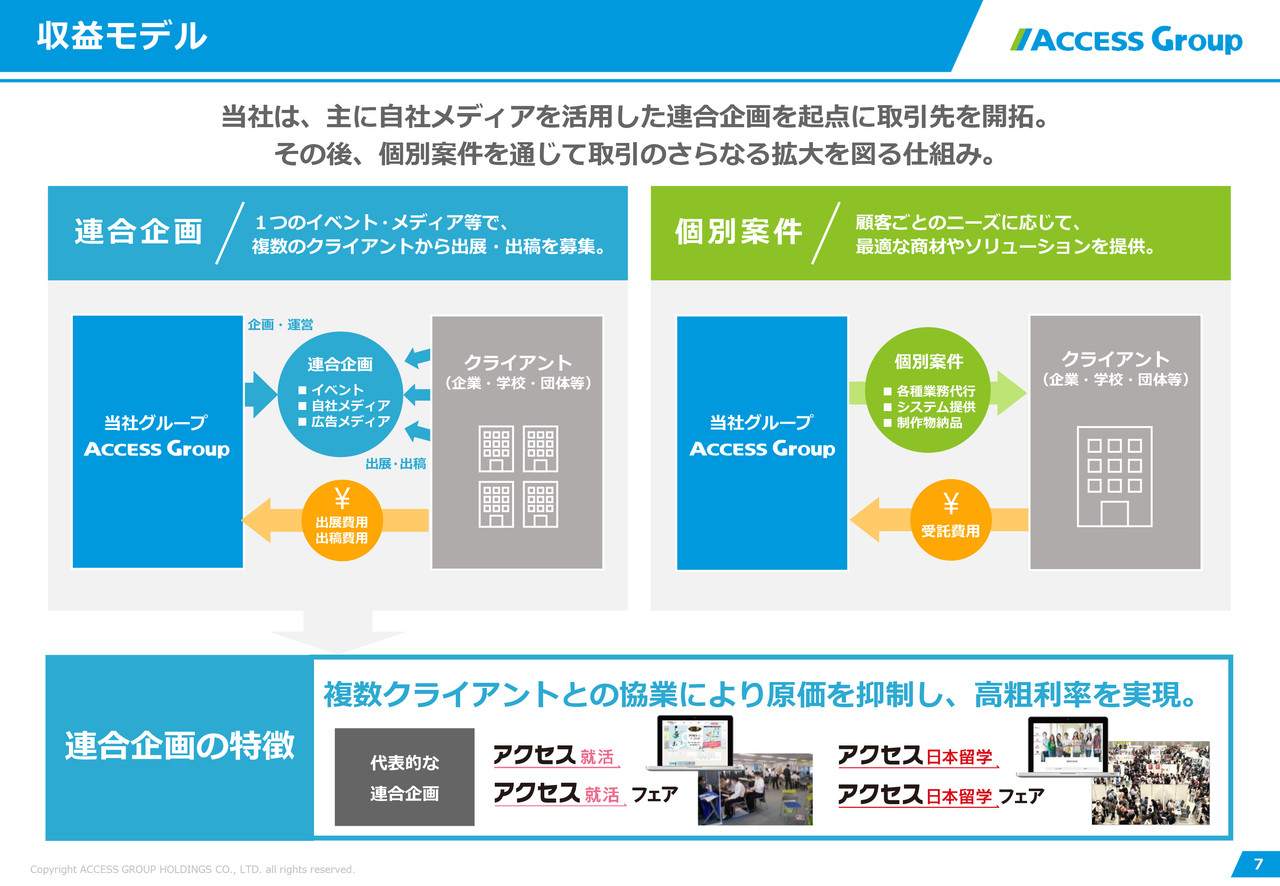 進学分野のメディア運営について、外国人留学生向けのメディアや合同進学説明会も展開しています。こちらは比較的安価で参加しやすいサービスですが、私たちは原価やある程度の開発費用、会場費・運営費などを除いた売上が徐々に積み重なり、高い利益率を達成しています。