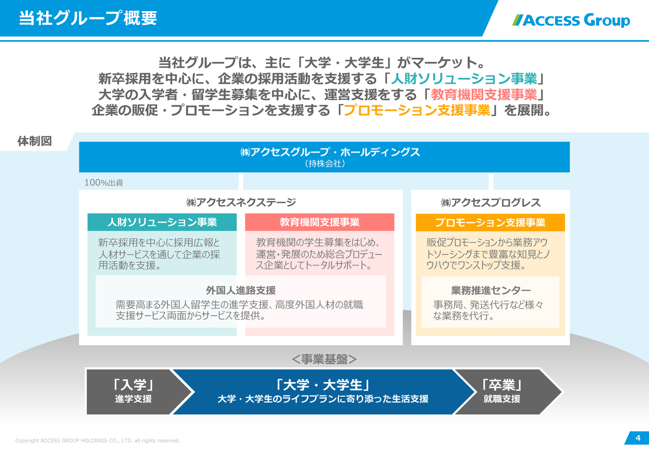 まず、当社グループには3つの事業があります。主に大学や大学生、就職活動をメインのターゲットとしてマーケットを展開しています。