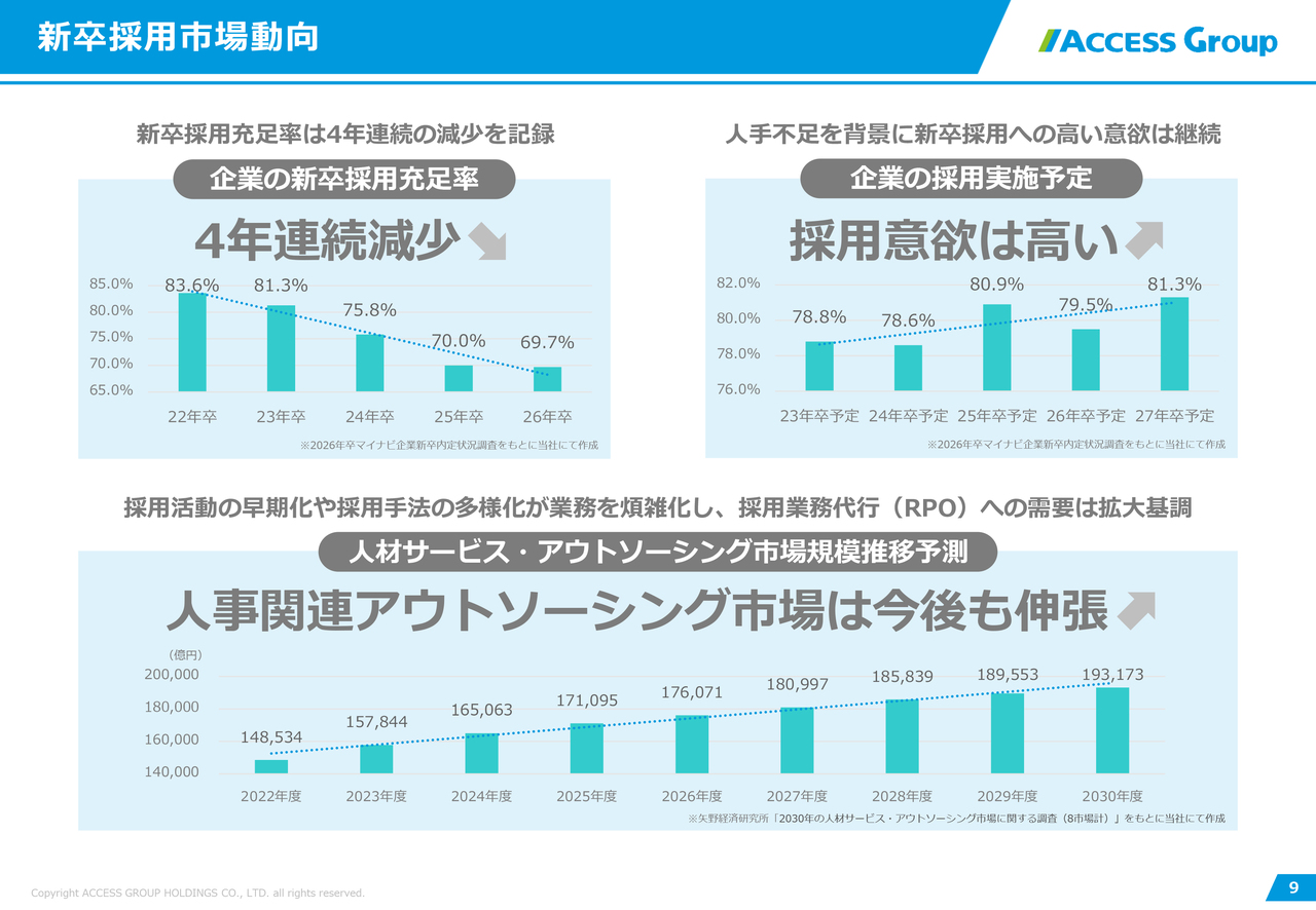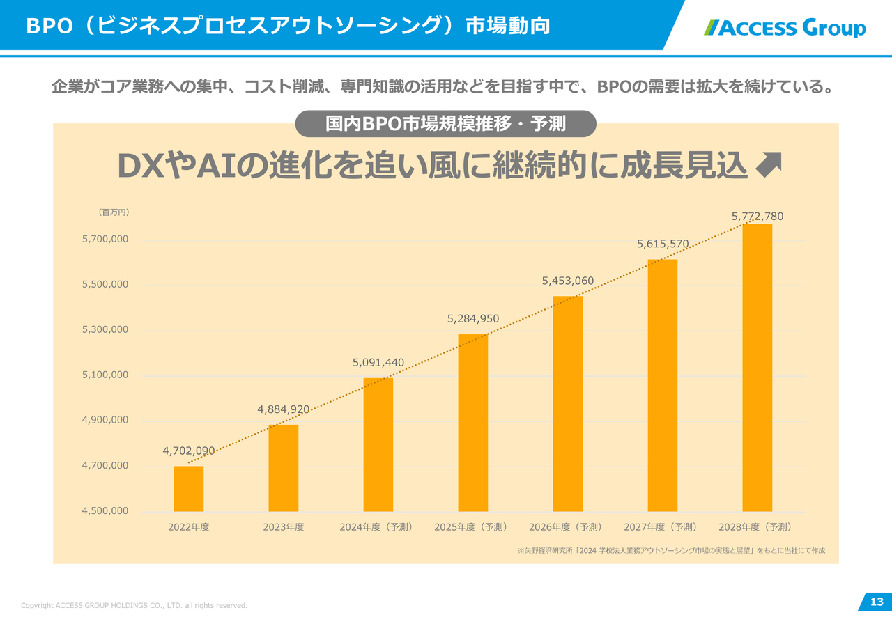 また、「なかなか人事に人が割けない。そうなったら、何十人、何百人という人事が必要になってしまう」という点についても、人事関連のアウトソーシングが今後も伸長していくという予測が出ています。これらの点に着目し、私たちは注力している状況です。