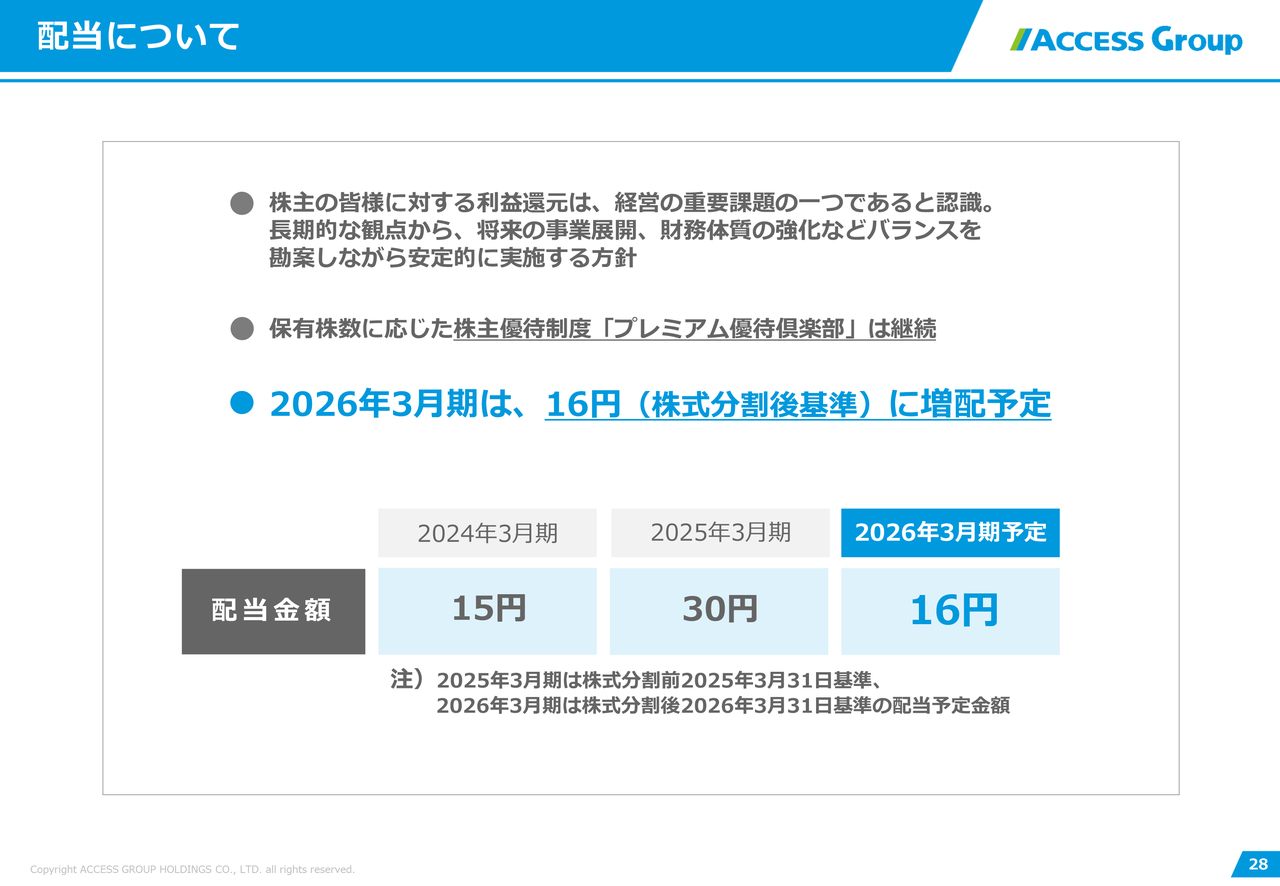 木村:配当についてです。株式分割を実施しており、実質的に増配となります。配当は16円とし、優待の利回りを含めると、先週末の終値を基準に4.5パーセントから5.4パーセント程度の還元を行うかたちとなります。