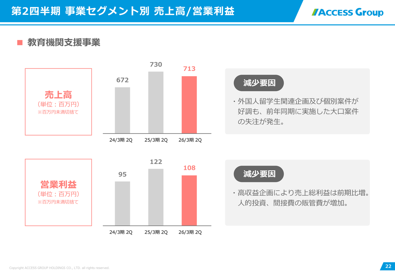 木村:教育機関支援事業についてです。大口の売上が一時的に剥落した影響で、売上高は前期よりやや減少しています。しかし、営業利益は前期比並みよりも少し下がっているものの、売上総利益率の向上によって改善が図られている状況です。