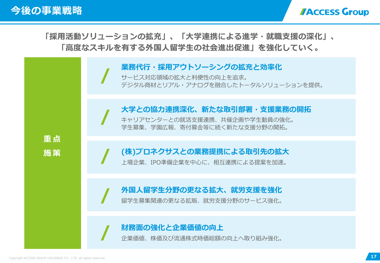 木村:今後の事業戦略については、スライドに記載のとおりです。時間の関係で詳細は割愛しますが、アウトソーシングの拡充と効率化、大学との協力関係はすべてにおいて必須であり、さらに深化させていきたいと考えています。そして、プロネクサス社との業務提携による取引先の拡大や、外国人留学生分野の拡大を同時並行で進めています。