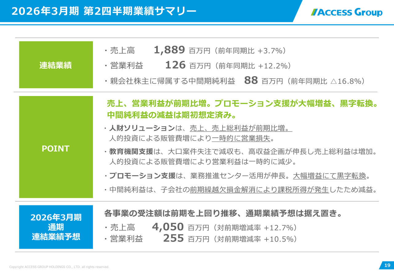 木村:2026年3月期第2四半期の業績についてご報告します。第2四半期が終了し、売上高は18億8,900万円、営業利益は1億2,600万円となりました。決して大きいボリュームではありませんが、先ほどお伝えした加速により、さらに拡大を目指していきたいと考えています。