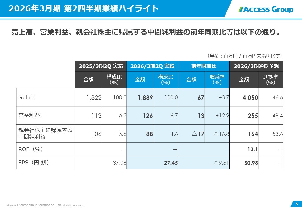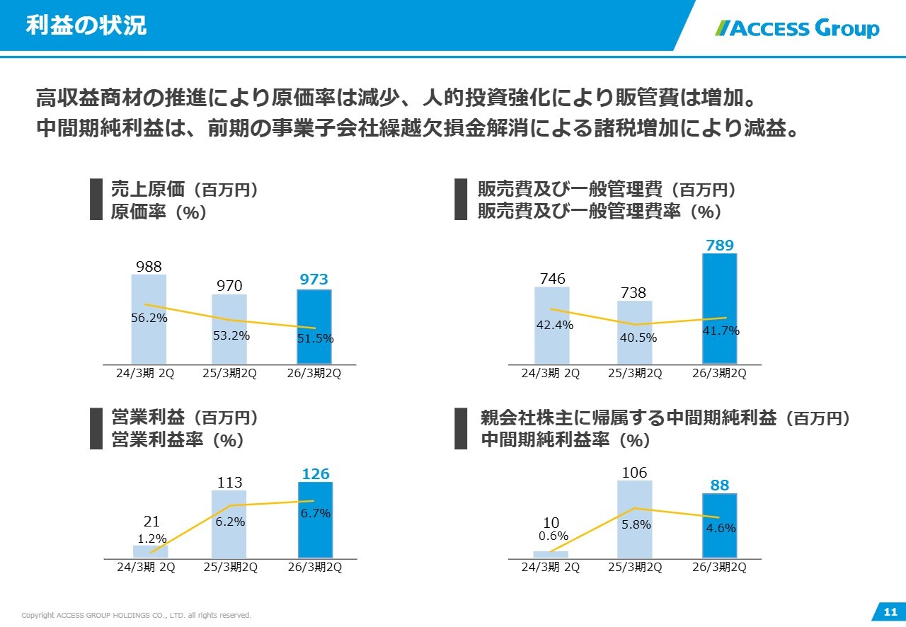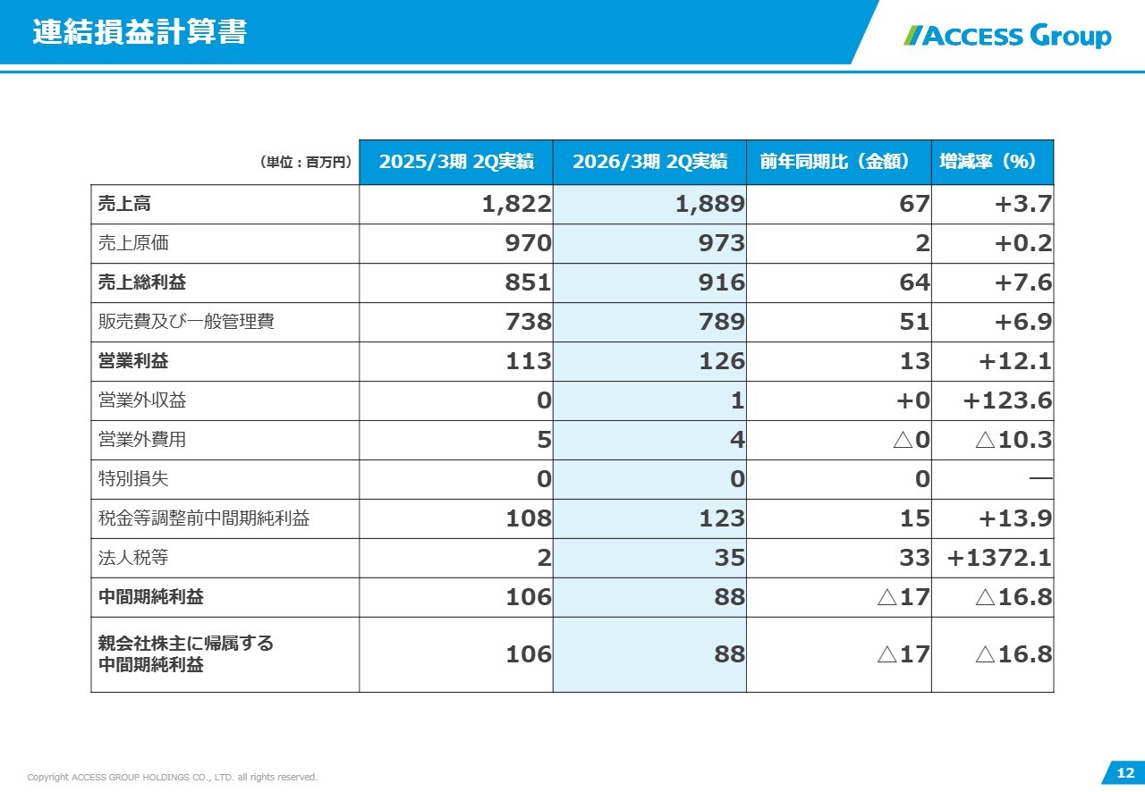 中間純利益については、子会社である株式会社アクセスネクステージの前事業年度における繰越欠損金の解消により課税所得が発生し、法人税、住民税、事業税が増加したため、減益となりました。これは期初より想定済みであり、通期業績予想どおりに推移しています。