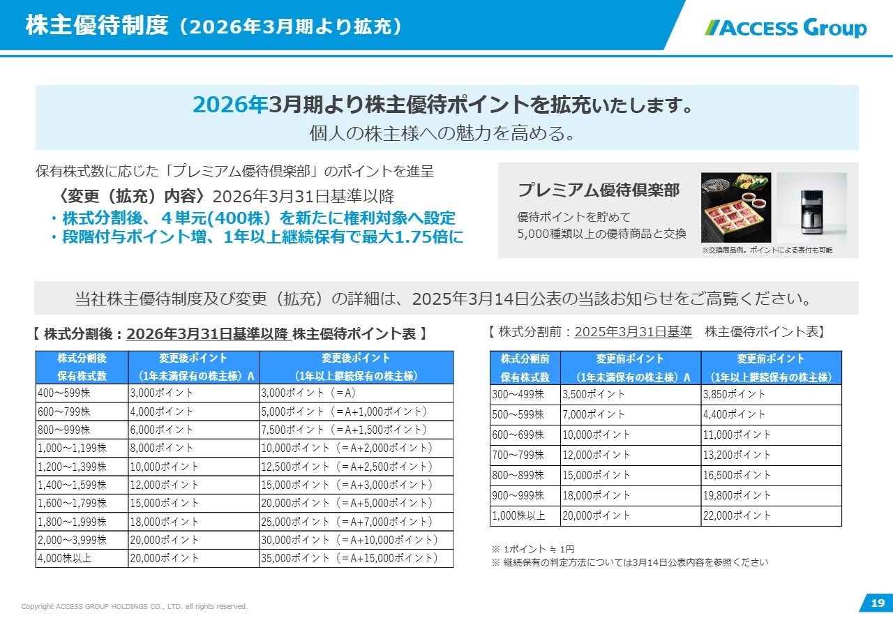 株主優待制度「プレミアム優待倶楽部」の拡充変更について補足します。進行期である2026年3月期より、株主優待対象基準保有株式数を4単元に引き下げ、段階付与ポイントや1年以上の継続保有ポイントの増加など、スライドに記載のとおり、リバランスを行いました。