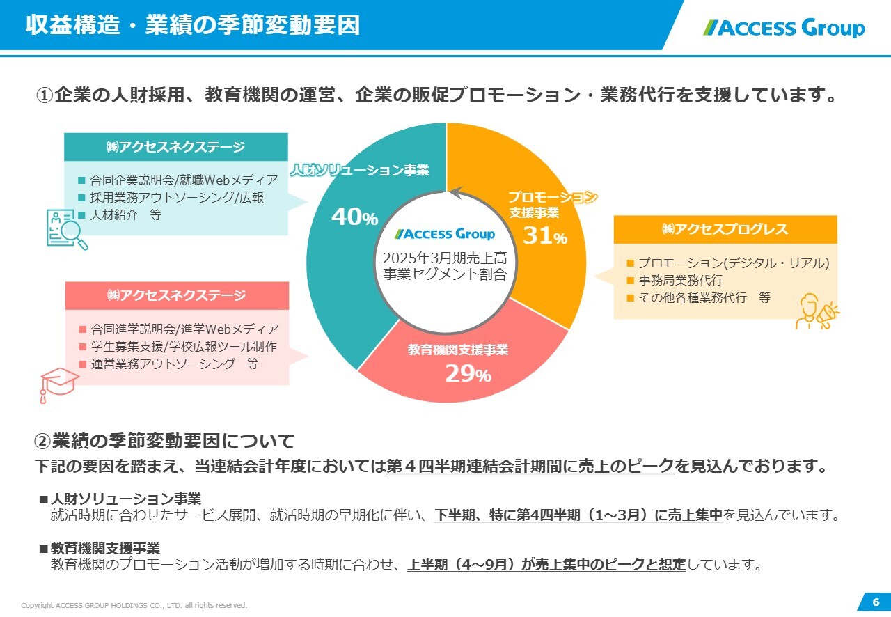 当社の収益構造と業績の季節変動要因についてです。当社は、企業の人財採用を支援する「人財ソリューション事業」、大学などの教育機関の運営を支援する「教育機関支援事業」、企業の販促プロモーションや業務代行を支援する「プロモーション支援事業」、以上の3事業を展開しています。前会計年度2025年3月期を基準とした各事業セグメントの売上割合は、グラフのとおりです。
