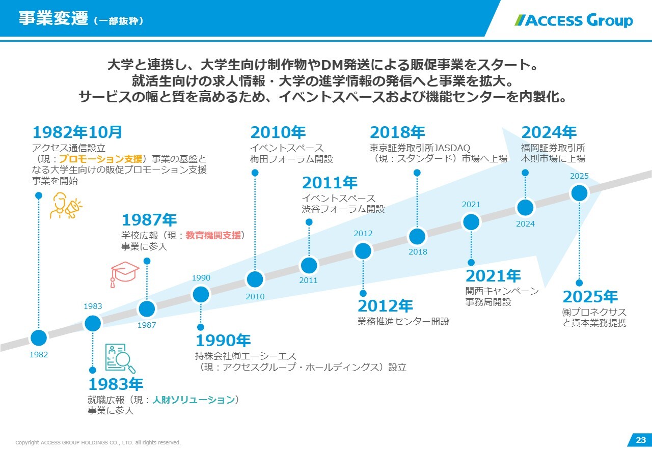 当社は、大学と連携し、大学生向けの制作物やDMを発送することで、大学生に向けて有益な情報を提供する事業を起源としています。時代の変遷とともに、Webを通じた情報サイトの提供だけでなく、自社でのイベントスペースの保有や、サービス拡充を目的とした印刷、発送、事務局代行機能の内製化などを進め、収益性の向上に努めてきました。