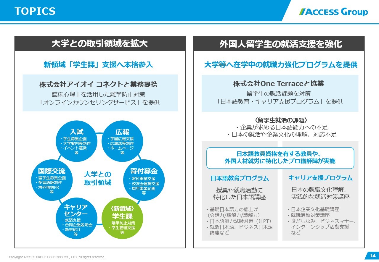 当連結会計期間および直近のトピックスをご紹介します。1点目は、大学との取引領域の拡大です。当社はこのたび、株式会社アイオイ コネクトと業務提携し、大学経営の課題となっている途中退学者の増加を防止するため、臨床心理士によるオンライン相談カウンセリングを教育機関から請け負う新サービスの提供を開始しました。