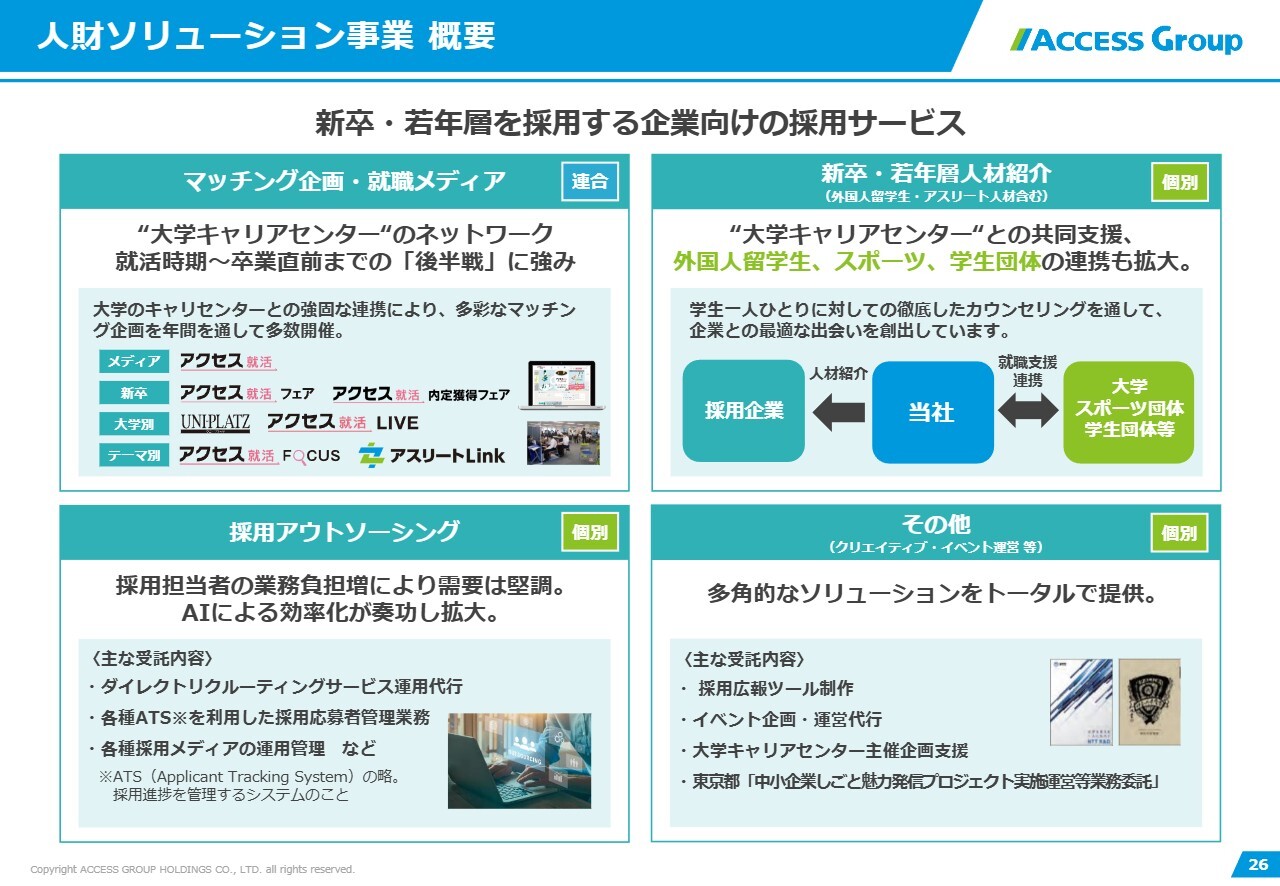 人財ソリューション事業では、合同企業説明会の販売を維持しつつ、採用アウトソーシングなどの採用広報関連業務やクリエイティブ制作業務が伸長し、売上高および売上総利益が前期比で増加しました。