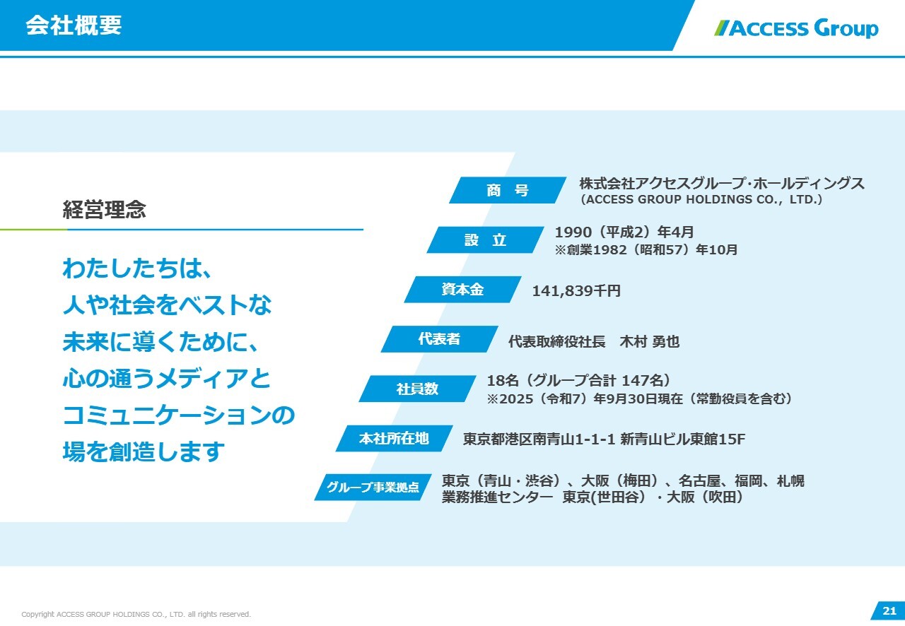 木村勇也氏:株式会社アクセスグループ・ホールディングス代表取締役社長の木村勇也です。ただいまより、2026年3月期第2四半期の決算説明を行います。どうぞよろしくお願いします。