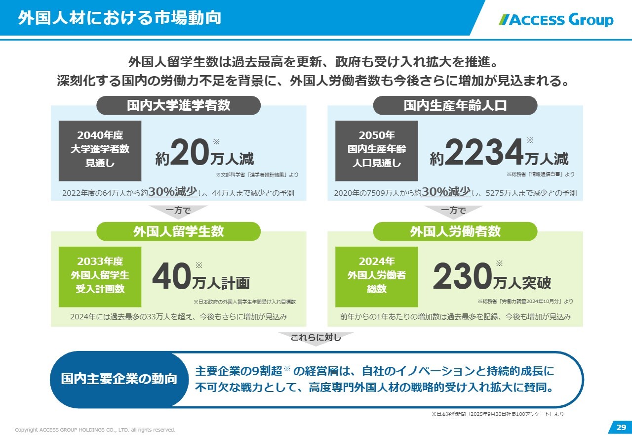 スライド右側の数字は、今後当社が注目しているマーケットです。日本の生産年齢人口は、25年後には2020年比で約30パーセントにあたる2,234万人の減少が予測されています。現在の外国人就労者数は230万人余りですが、生産年齢人口の減少を踏まえると、外国人就労マーケットの拡大が見込まれます。