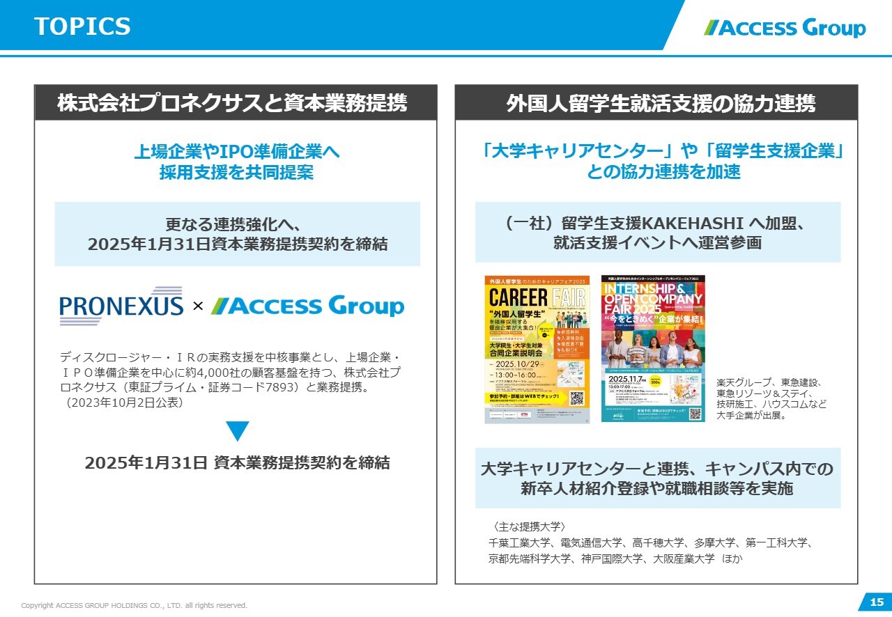 3点目は、すでに発表していますが、2025年1月31日に株式会社プロネクサスと資本業務提携を行いました。同社は上場企業やIPO準備企業を中心に約4,000社の取引基盤を持ち、ディスクロージャー・IRの実務支援を中核事業としています。現在、人財ソリューション事業を中心に顧客企業への共同提案を展開しており、当期の業績にも寄与しています。