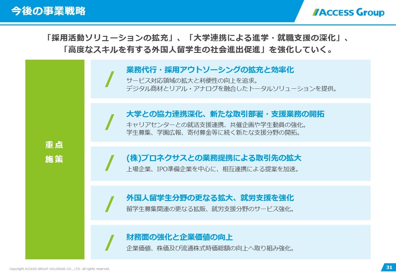 これらを踏まえ、当社の今後の重点施策をまとめています。業務代行・採用アウトソーシングの拡充と効率化、大学との協力連携の深化、新たな取引部署・支援業務の開拓、株式会社プロネクサスとの資本業務提携による上場企業を中心とした取引先の拡大、外国人留学生分野のさらなる拡大、就労支援の強化、そして財務面の強化と企業価値の向上です。