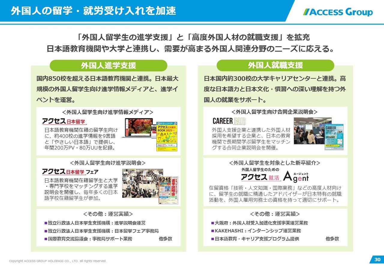 スライド左側の数字は、留学してくる外国人の受け入れ計画を示しており、当社がすでにトップシェアを獲得している領域です。大学も引き続き受け入れを加速させていく計画です。