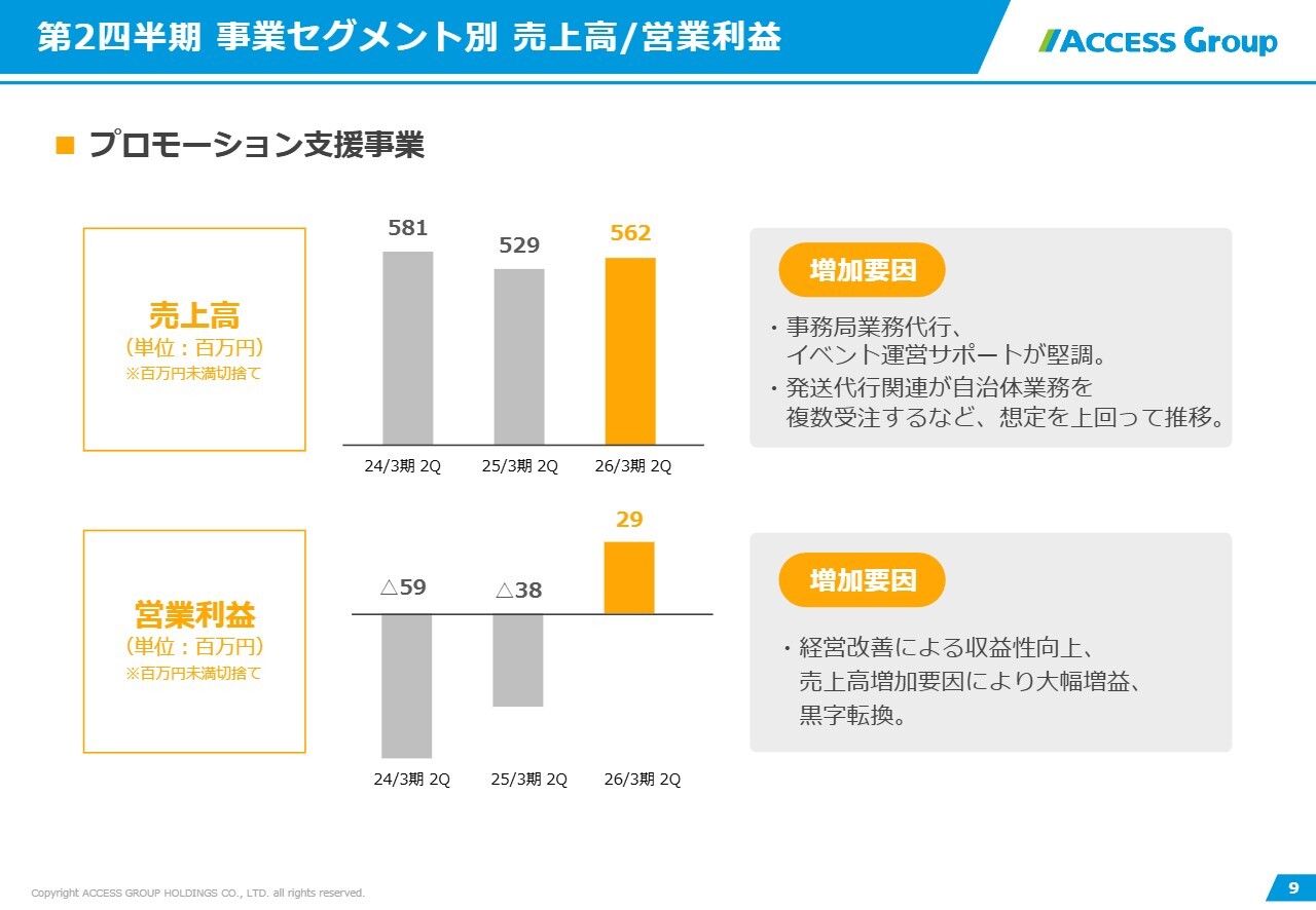 売上高と営業利益は前期を上回りました。プロモーション支援事業は黒字転換を果たしています。中間純利益は減益となりましたが、これは期初から想定していたものです。