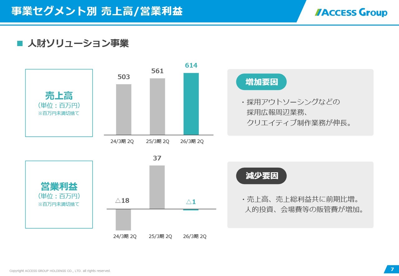 事業セグメント別の売上高と営業利益の増減要因についてです。人財ソリューション事業の売上高は6億1,400万円となりました。主に採用アウトソーシングなどの採用広報周辺業務やクリエイティブ制作業務が伸長し、前年同期比で増加しました。
