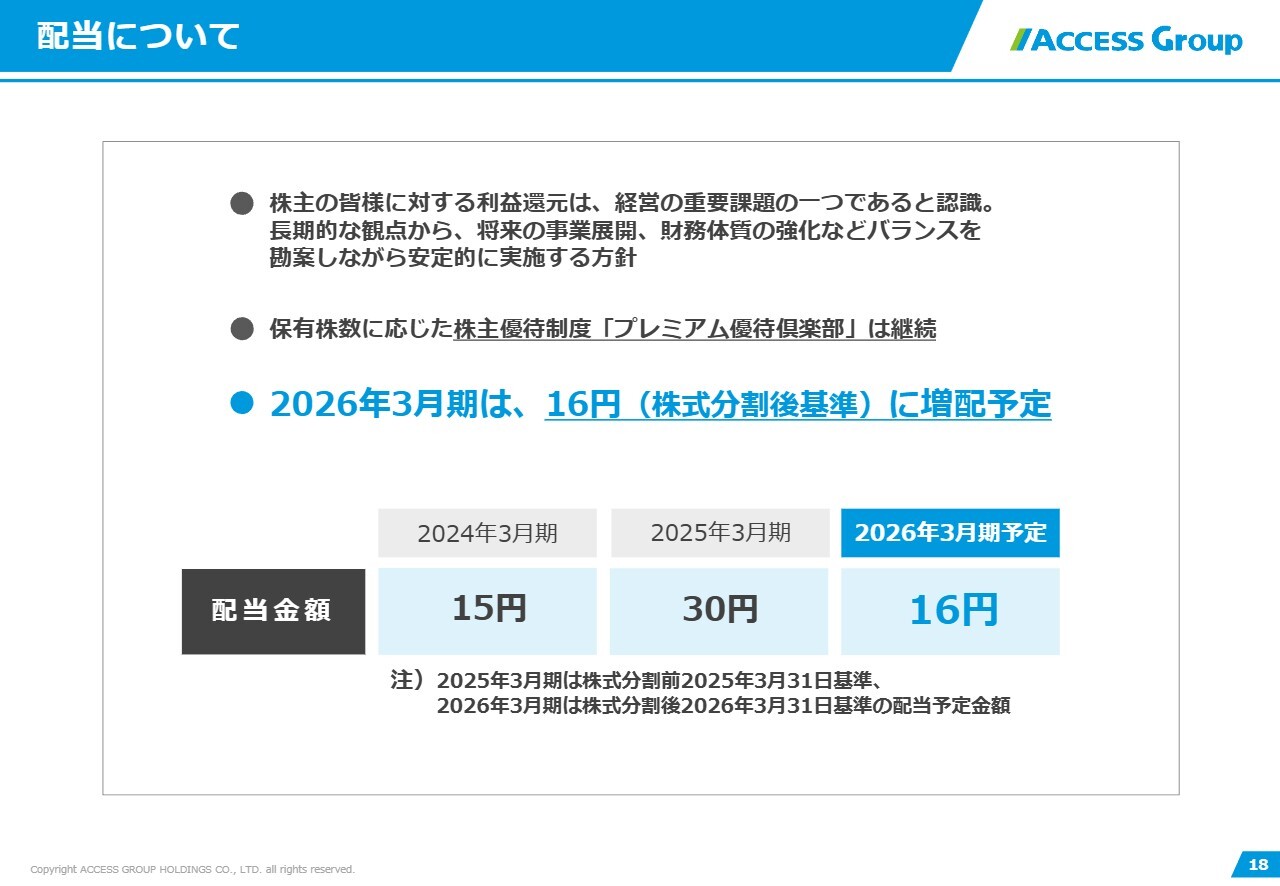 2026年3月期の配当予想は16円です。スライドに記載のとおり、2025年3月期および2024年3月期の配当実績は、本年4月1日に実施した株式分割前の基準であるため、実質的には増配となります。