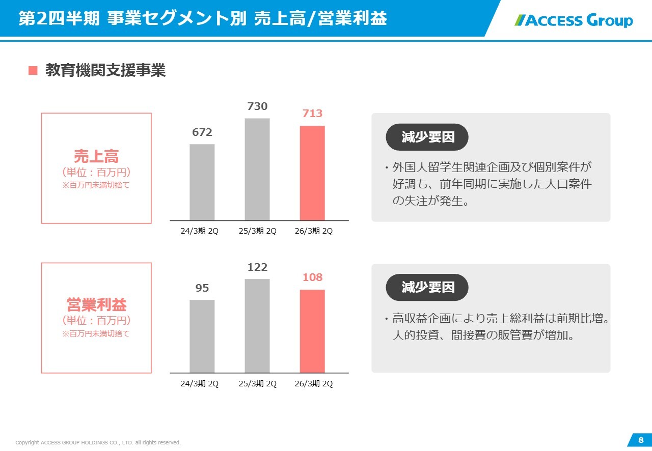 教育機関支援事業の売上高は7億1,300万円です。外国人留学生関連の企画や公的機関からの受注が好調に推移したものの、前年同期に実施した大口案件を失注したため、前年同期比で減少しました。