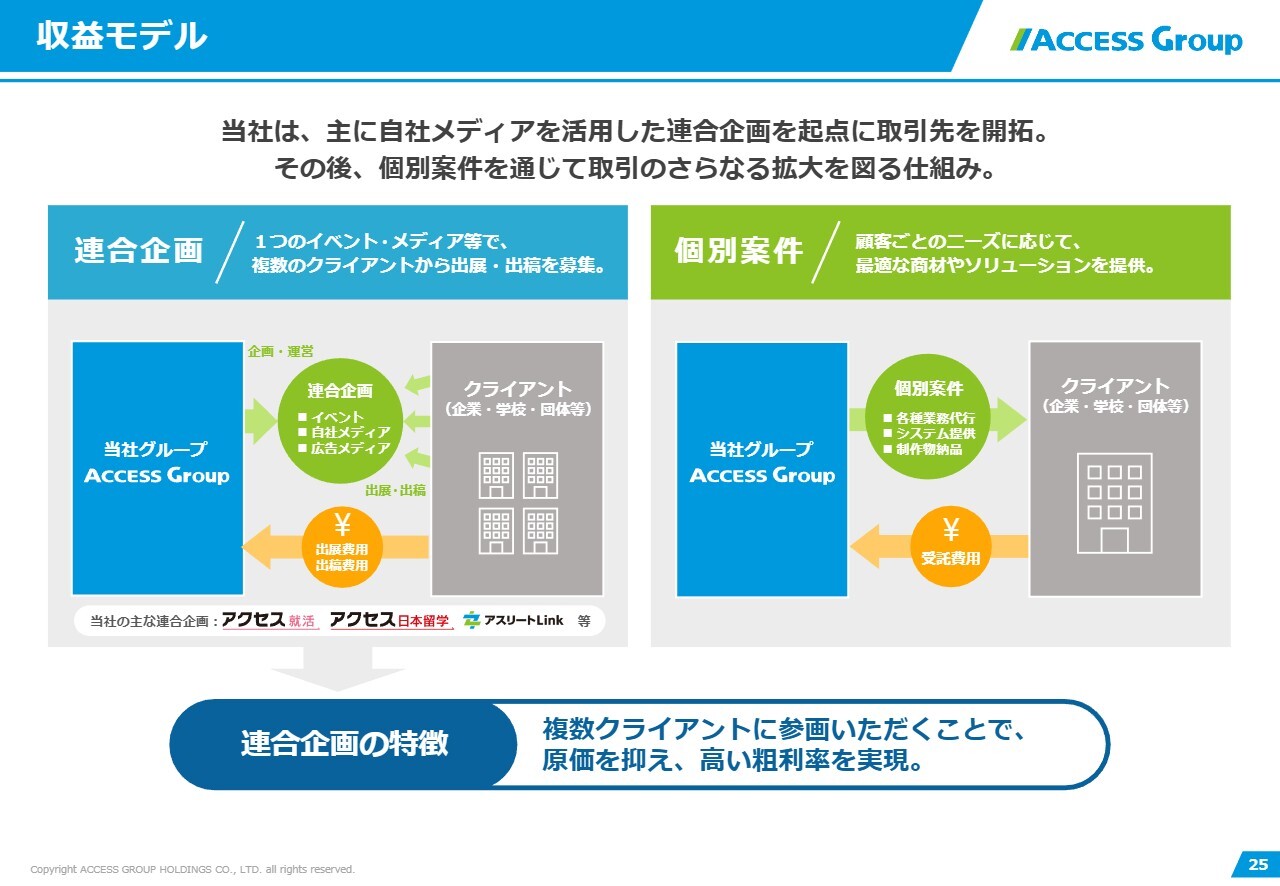 当社のビジネスモデルは、連合企画と個別案件の2種類に分けられます。連合企画は、自社の企画でWebメディアや情報誌を発行し、イベントを行うことで、参画クライアントからの売上によって収益を上げるモデルです。売上単価は高くないものの、利益率が高いことが特徴です。