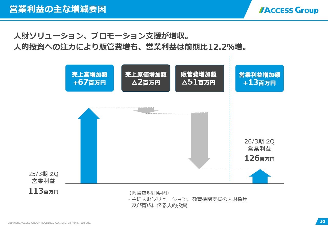 営業利益の主な増減要因は記載のとおりです。前項で説明したとおり、人財ソリューションやプロモーション支援が増収となりました。人財の採用や育成を強化するための先行投資により販管費が増加しましたが、連結営業利益は前年同期比で1,300万円増加し、増減率は12.2パーセントとなりました。