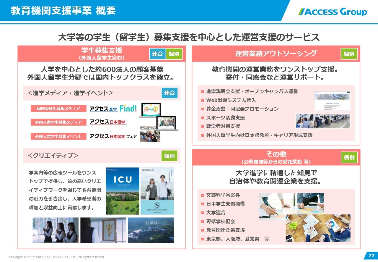 教育機関支援事業では、前年同期に実施した大口案件の失注により減収となりましたが、外国人留学生募集企画をはじめとする高収益商材や個別受託案件が好調に推移し、売上総利益は前期比で増加しました。
