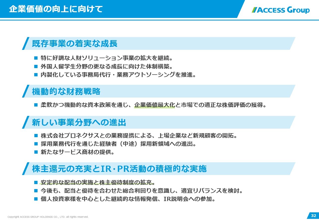 企業価値の向上に向けた取り組みは、スライドに記載のとおりです。既存事業の着実な成長に加え、企業価値の最大化と適正な株価評価に向けた機動的な財務戦略、株式会社プロネクサスとの協業領域拡大、新しい事業分野への進出、配当や株主優待制度による株主のみなさまへの還元、そしてPR活動の積極的な実施を、当社の大変重要なテーマと捉えています。これらの取り組みを今後も推進し、決定した際には速やかにお知らせします。